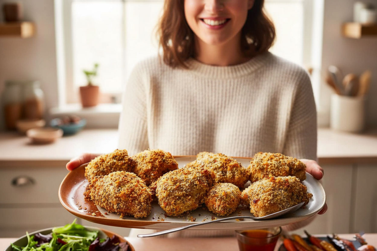 4. Arrange and Bake: Place each coated chicken piece on the prepared wire rack with the uncoated (bottom) side facing down. Bake for about 35 minutes, or until the coating is golden and crispy and an instant-read thermometer inserted into the thickest part of the chicken registers 160°F (71°C).
