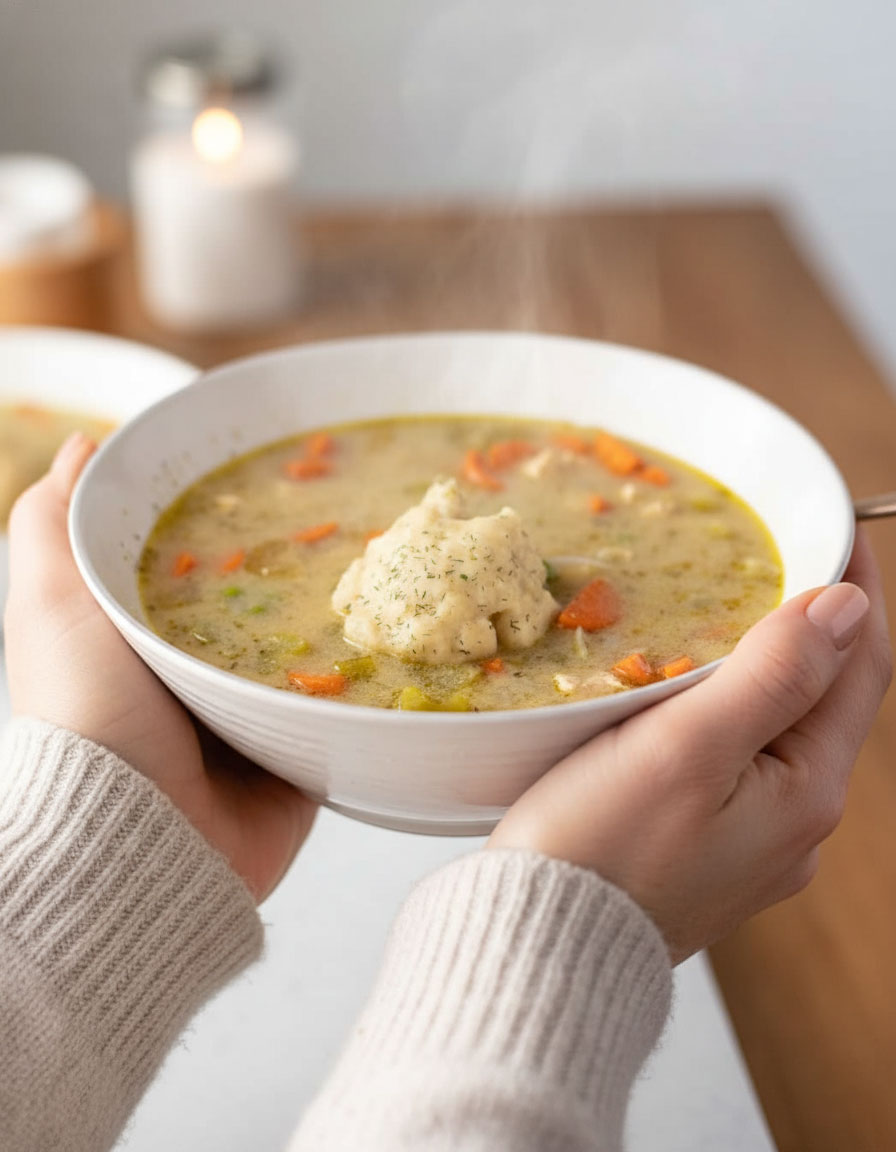 1. While the chicken cools, make the dumplings. In a large bowl, whisk together the flours (tapioca/arrowroot and coconut), sea salt, and baking soda.